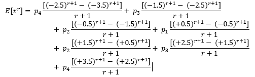 The r-th moment is calculated piecewise, for each rectangle, with the contribution from a rectangle being as seen here with the understanding the the value 1÷(b-a) in the link is pₖ in the formula below, for k = 1, 2, 3 and 4. (Please be aware that I’m exploiting the fact that the width of the rectangles is unity; this simplifies the algebra below.) Under the conditions specified, the formua for the rth moment is as follows: