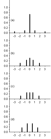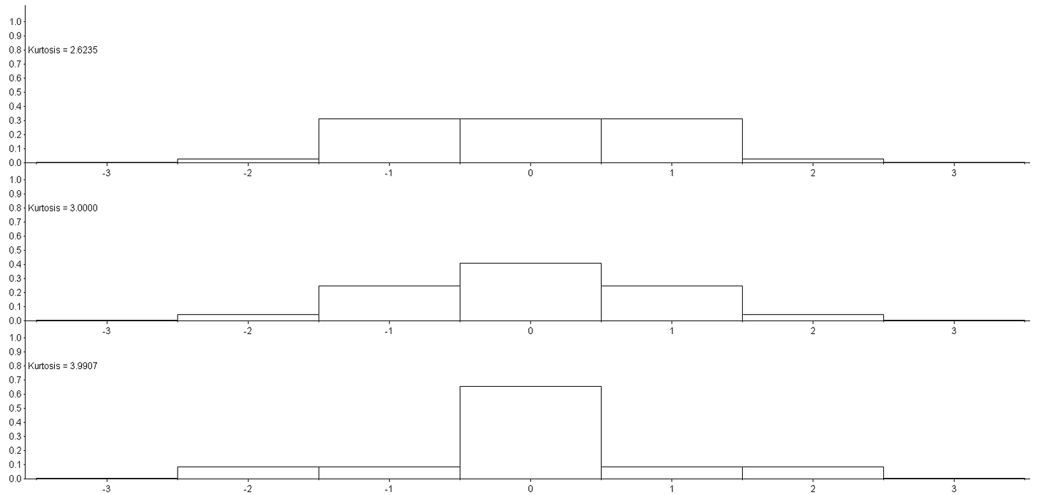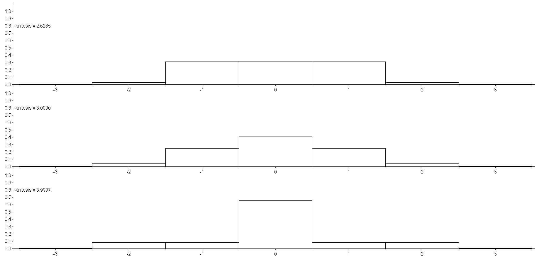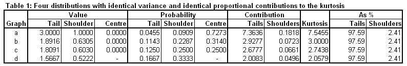 We can continue down this road, making the probability of the centre be the same as in either shoulder, distribution (c) in the table and graphs, yielding a kurtosis of 2.7438. We can even remove the centre, distribution (d) in the table and graphs, from the distribution, as long as this is done in a manner to keep the variance at unity and the proportional contributions to the kurtosis at 0.9759:0.0241. Even though this fourth distribution is not a member of the family described above (strictly, it would be bimodal if it were), it still has unit variance and the contributions to the kurtosis (2.0579) is still 0.9759:0.0241 from the tails and shoulders respectively. It’s important to distinguish this case (one with 4 values) from the case of 5 values where the value at the centre, 0, has a probability of 0. I mean to exclude bimodality. Distribution (d) is meant to be the same as distribution (a) in two crucial aspects - the variance is unity and the proportional contributions of the tails and shoulders to the kurtosis is the same. The distributions are intended to differ only in the excising of the centre. This changes the kurtosis from 7.5455 to 2.0579, making the point that the presence of the centre, the peakedness of the distribution, contributed to the large kurtosis value distribution (a) has, despite the fact that the centre contributed nothing (zero) to the value of 7.5455.