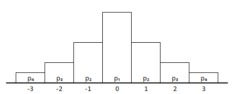 The graphs (distributions) used in the presentation above are a bit “thin” or “spiky” because they are discrete distributions. In this appendix a simple continuous example is presented. The strategy is a little different. In the example following, the values of the distribution are assumed to vary between -3.5 standard deviations and +3.5 standard deviations and they are grouped into 7 groups of length of one standard deviation. In each of the intervals the values are assumed to be equally likely. The probabilities for the values covered by the 7 rectangles are p₄ for the two tails (between -3.5 and -2.5 on the left and +2.5 to +3.5 on the right), p₃ for the next two groups towards the centre, p₂ for the next pair and p₁ for the central group (from -0.5 to +0.5).