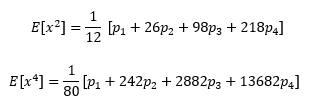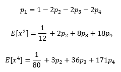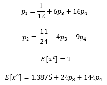 Next, since E[x] = 0, Var(x) = E[x²] so if we impose the restriction Var(x) = 1, we can solve for p₂ to obtain p₂ = 11÷24 - 4p₃ - 9p₄. Substituting this into the equations above, we get: