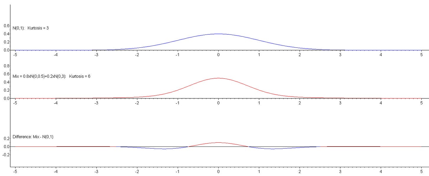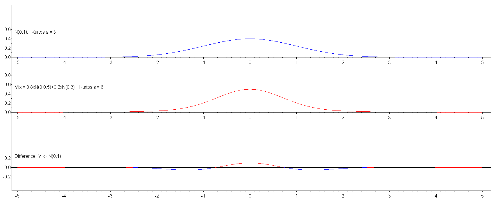 Having established a point of reference, Westfall modifies all three distributions in the same way by (in effect) moving some of the distribution out from the body of the distribution into a distant point in the tails either side of the body of a distribution. In technical terms, he creates a mixed distribution for each of the original distributions. If f(x) is one of the original distributions then for another distribution g(x), a mixed distribution is p·f(x)+(1-p)·g(x), 0<p<1. The distribution g(x) Westfall uses (with p slightly less than 1) increase the kurtosis of all three mixed distributions to approximately 6 - but the graph (Figure 3) of the mixed distributions is indistinguishable from the original distributions. Westfall’s presentation is highly technical and inaccessible to the ordinary reader.